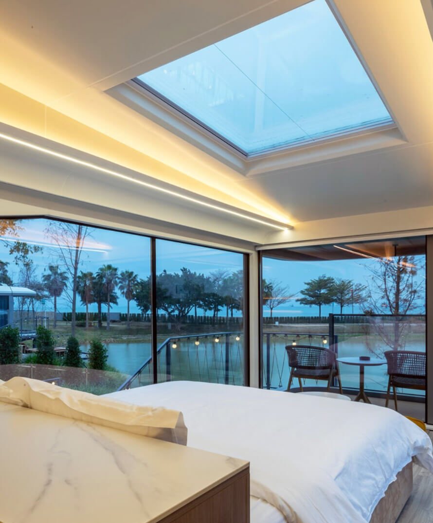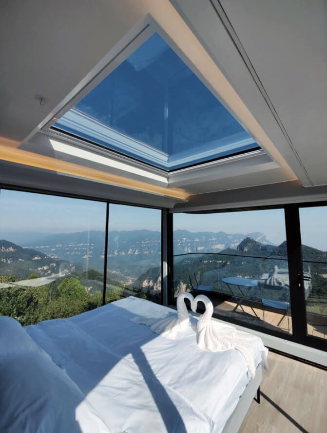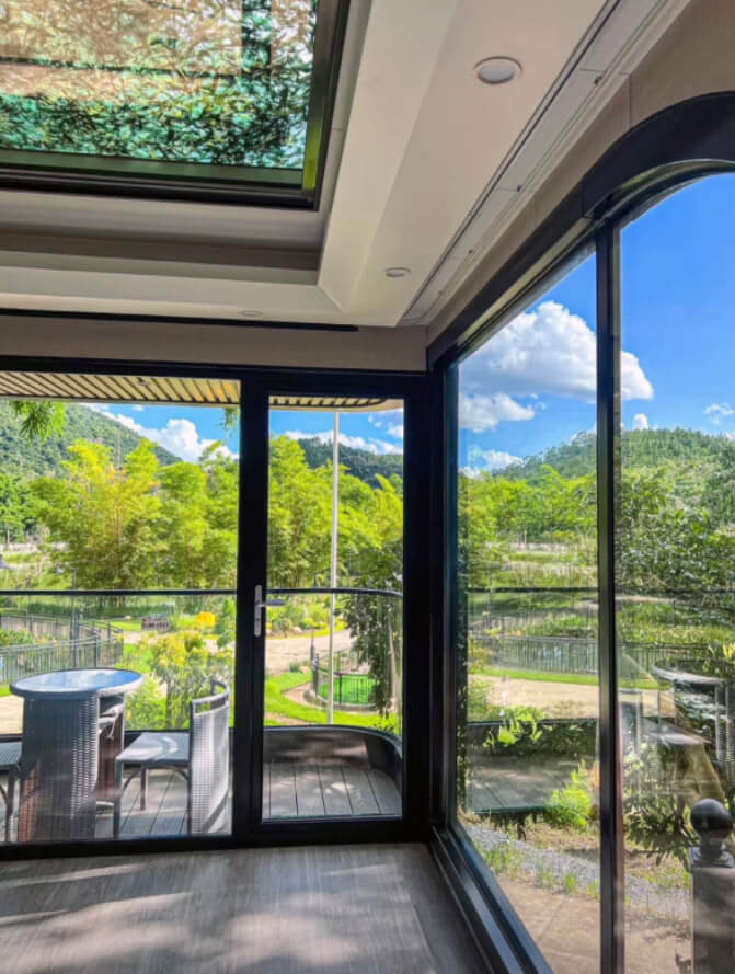 z panoramicznymi oknami zapewniającymi kontakt z naturą.